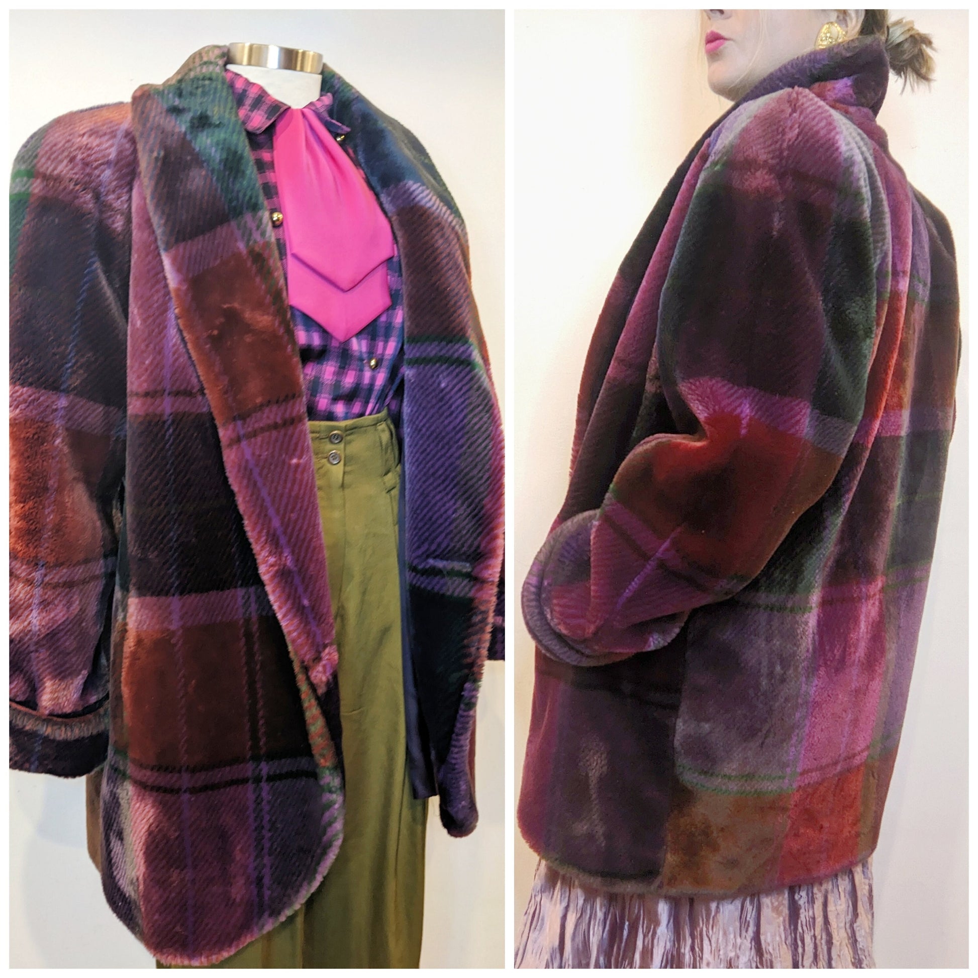 Gorgeous vintage 1980s Donny Brooks faux fur jacket in shades of purple + pink plaid. Oversized statement shoulders with sewn in shoulder pads. Dramatic collar + single button closure. Pockets at hips with leather trim. Fully lined.