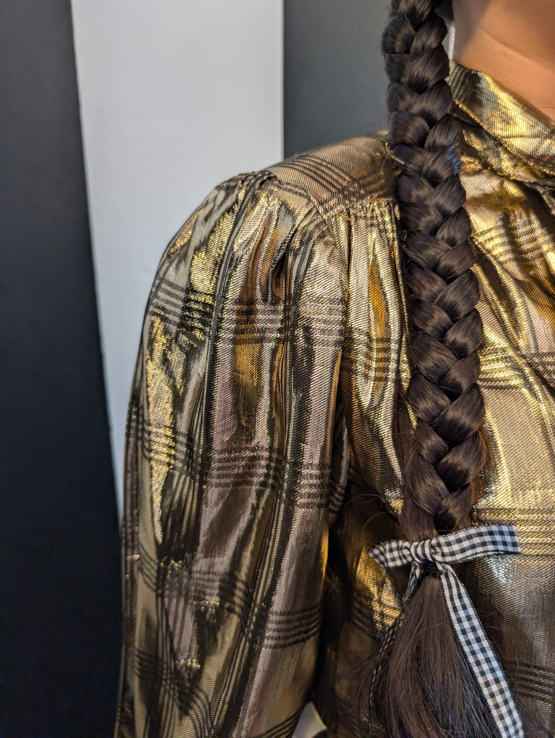 80s Gold Lamé Plaid Pussycat Bow Blouse