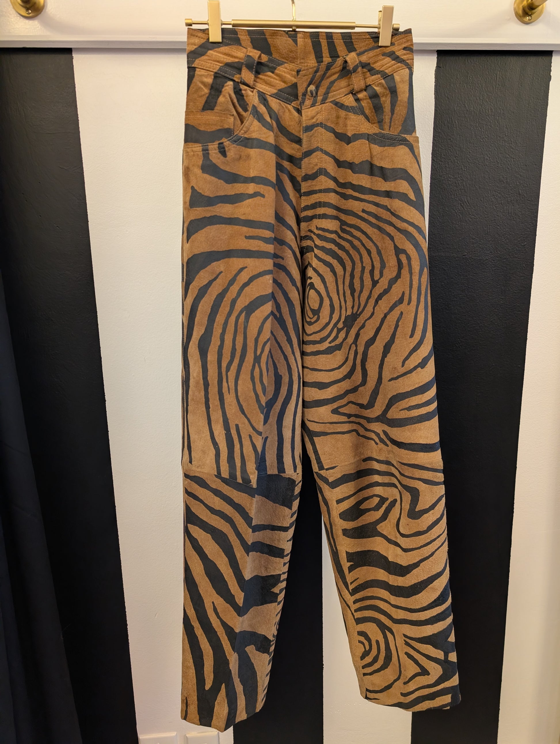 High-rise 5 pocket pant in a suede tiger print. Zipper fly front. Baggy, slouchy fit with a tapered ankle. Interior lining.
