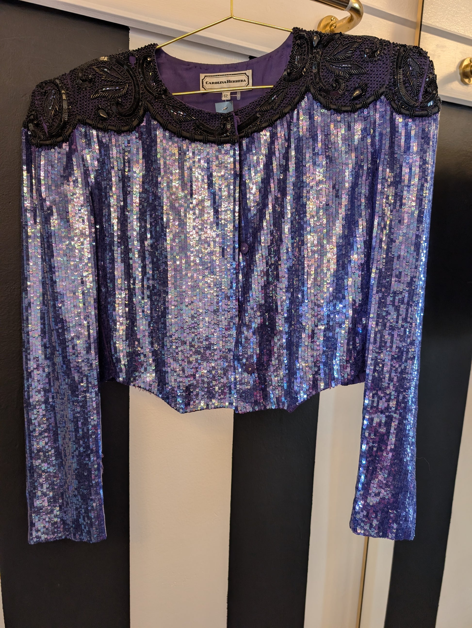Cropped jacket with full lining and sewn in shoulder pads. Snap closures at front.
