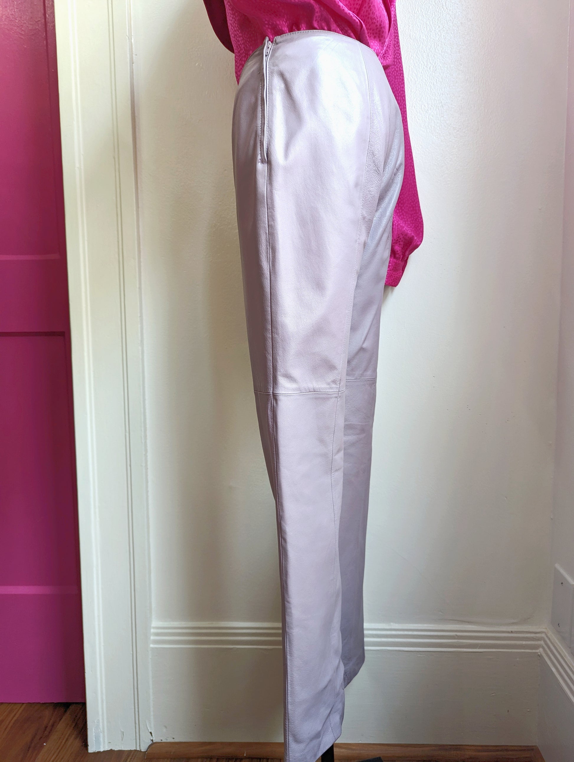 Purple leather pant with side zip. Long inseam likely intended for tailoring to right length.